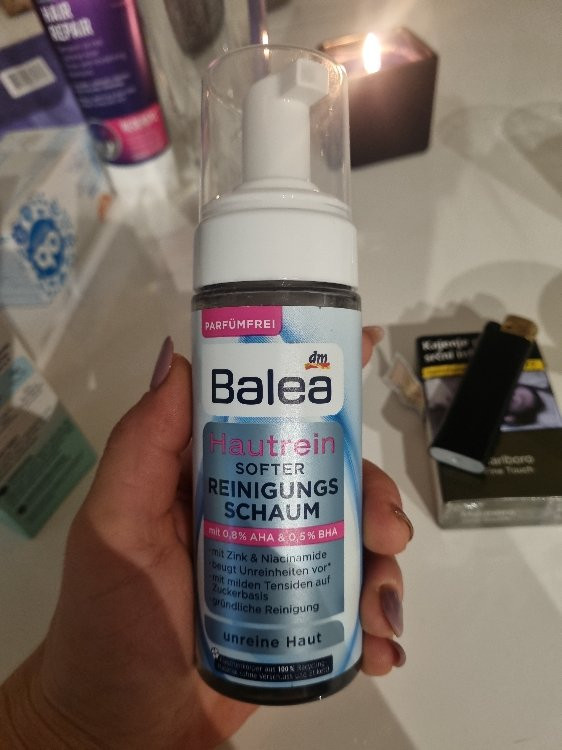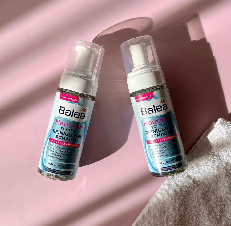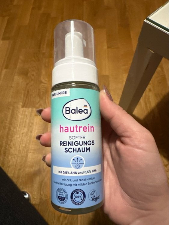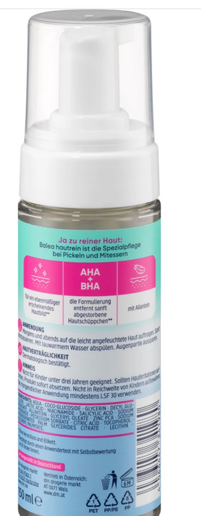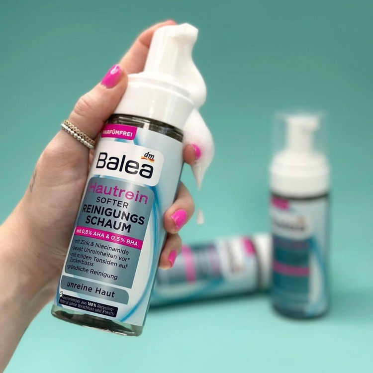 فوم پاک کننده Balea hautrein به آرامی پوست را تمیز و لایه برداری می کند. ترکیب موثر AHA (اسید لاکتیک) و BHA (اسید سالیسیلیک) به آرامی سلول های مرده پوست را از بین می برد و پوست را درخشان تر نشان می دهد. فرمول حاوی روی و ماده فعال مد روز نیاسینامید می تواند محتوای چربی پوست را تنظیم کند و رنگ چهره را یکدست تر نشان دهد. ماده فعال آلانتوئین به عنوان تسکین دهنده پوست و گرد کردن فرمول شناخته شده است. دستور العمل بدون میکروپلاستیک .