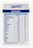نام دقیق محصول: مکمل غذایی حاوی ویتامین ها و مواد معدنی فسفات کلسیم، اکسید منیزیم، فیلر هیدروکسی پروپیل متیل سلولز، کربنات کلسیم، اسید ال اسکوربیک (ویتامین C)، مالتودکسترین، فیلر میکروکریستالی سلولز، DL-α-توکوفریل استات (فروویتومارآمین آمین) نیکوتین آمید، کلسیم D-پانتوتنات، سیترات روی، نمک های منیزیم اسیدهای چرب، ماده پوشش دهنده هیدروکسی پروپیل سلولز، سولفات مس، پیریدوکسین هیدروکلراید (ویتامین B6)، اکسیدهای آهن رنگی و منیزیم هیدروکسیدهای آهن، مانیل مانیز 2 سولفین، سولفات آهن، تیامین مونونیترات (ویتامین B1)، دی اکسید سیلیکون، ماده ضد انباشتگی، اسید پتروئیل مونوگلوتامیک (اسید فولیک)، کروم (III) -کلرید، رتینیل استات (ویتامین A)، یدات پتاسیم، مولیبدات سدیم، فیلوکینون (ویتامین K) -بیوتین، سلنیت سدیم، کوله کلسیفرول (ویتامین D3)، سیانوکوبالامین (ویتامین B12).