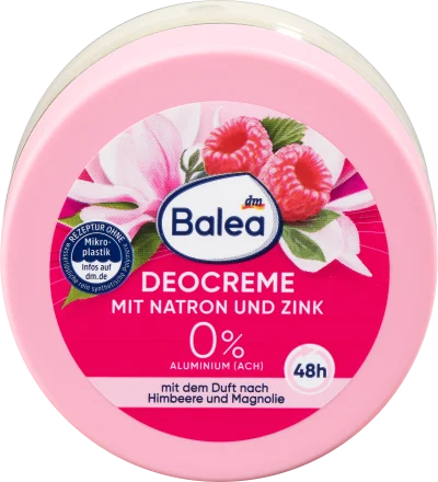فرمول غنی کرم دئودورانت تمشک Balea با جوش شیرین و روی، محافظت 48 ساعته از دئودورانت را ارائه می دهد. به لطف جوش شیرین با ظاهر طبیعی، بافتی با بوی میوه، زیر بغل را تغذیه می کند. علاوه بر این، فرمول بدون آلومینیوم به طور ایده آل با تجزیه عرق و تشکیل بوی مرتبط با آن مقابله می کند. دستور غذا بدون میکروپلاستیک و پلیمرهای کاملا مصنوعی.