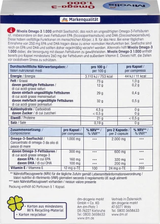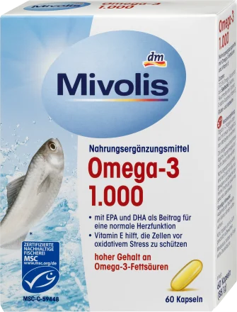 کپسول Mivolis Omega-3 1000 حاوی روغن ماهی دریایی است که سرشار از اسیدهای چرب امگا 3 غیر اشباع به ویژه دو اسید چرب EPA (ایکوزاپنتانوئیک اسید) و DHA (دوکوزاهگزانوئیک اسید) است. اینها عملکردهای مختلفی در بدن انسان دارند، به عنوان مثال برای قلب. ماهی های دریایی سرشار از EPA و DHA هستند و بنابراین باید به طور منظم مصرف شوند. از طرف دیگر، Mivolis Omega-3 1000 به اطمینان از تامین این اسیدهای چرب کمک می کند. کپسول ها همچنین حاوی ویتامین E هستند. این می تواند به محافظت از سلول ها در برابر استرس اکسیداتیو کمک کند.