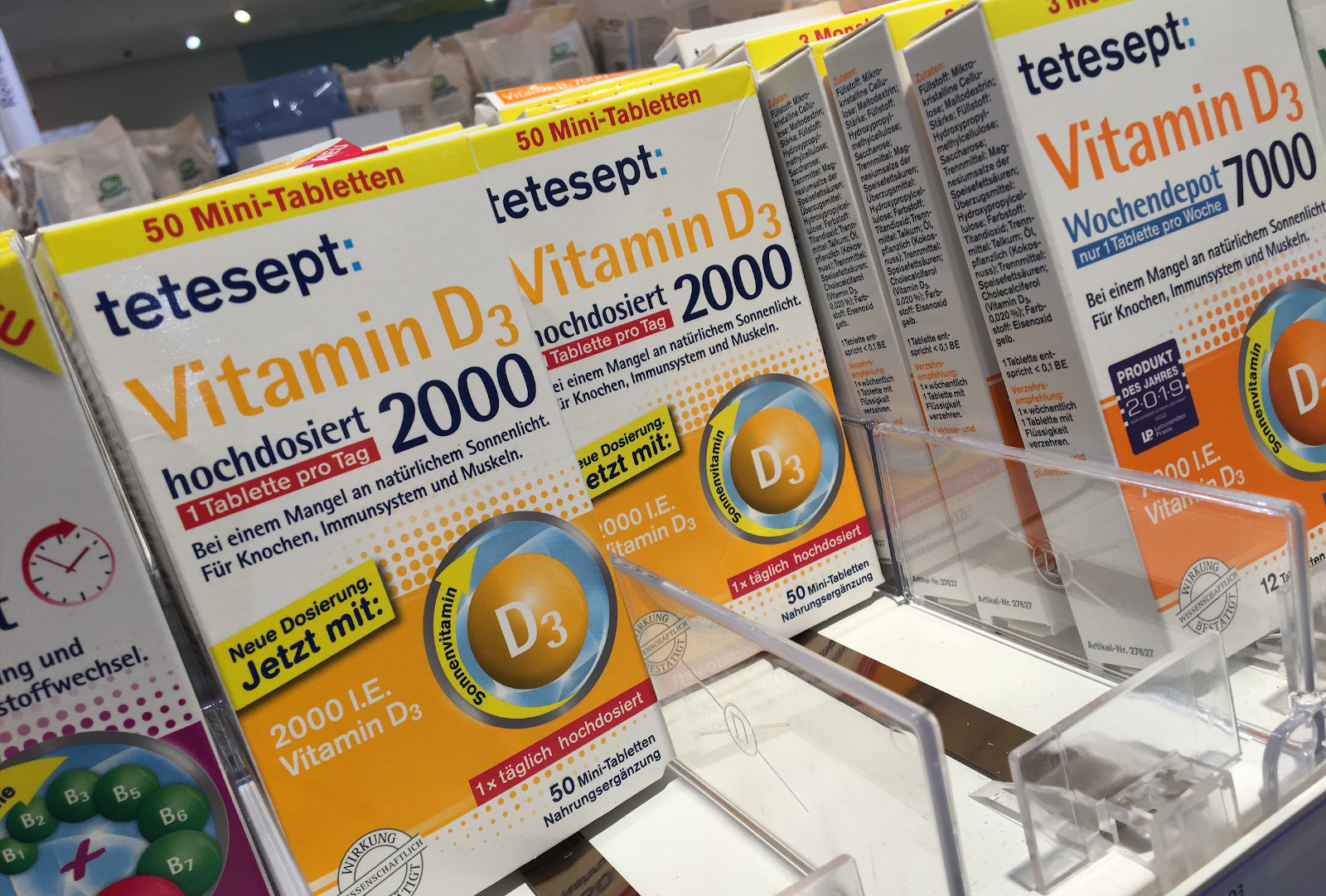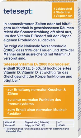 قرص ویتامین D3 tetesept حاوی دوزهای بالایی از ویتامین D3 است. این کار عملکرد طبیعی سیستم ایمنی، حفظ عملکرد طبیعی ماهیچه ها و استخوان های طبیعی و حفظ دندان های طبیعی را تضمین می کند.