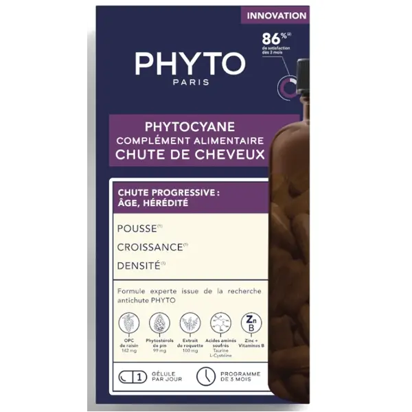 فیتوسیان (Phytocyane) یکی از قویترین مکملهای ضدریزش موی فرانسوی است که برای زنان و مردان طراحی شده و با ترکیباتی کاملاً طبیعی، به توقف ریزش مو، تقویت فولیکولها و افزایش رشد مو کمک میکند. این مکمل با بهرهگیری از عصاره دانه انگور، ویتامینهای B، زینک و آمینواسیدها، جریان خون پوست سر را بهبود میدهد و محیطی سالم برای رشد مجدد موها فراهم میسازد.