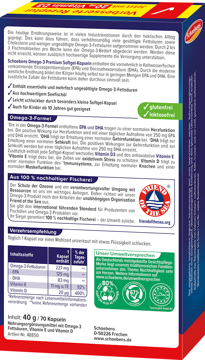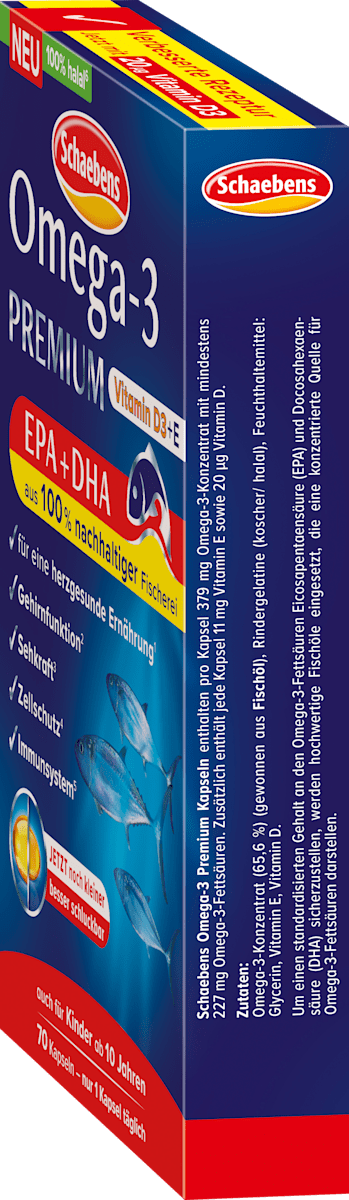 کپسولهای روغن ماهی پریمیوم امگا ۳ Schaebens منبع غلیظی از اسیدهای چرب امگا ۳ مانند EPA و DHA را ارائه میدهند که میتوانند به عملکرد طبیعی قلب کمک کنند*. این کپسولها به راحتی در برنامه روزانه شما جای میگیرند و مکملی ایدهآل برای یک رژیم غذایی متعادل هستند. با ۷۰ کپسول در هر بسته، این کپسولها یک راه حل مناسب برای دریافت روزانه اسیدهای چرب ضروری شما ارائه میدهند.