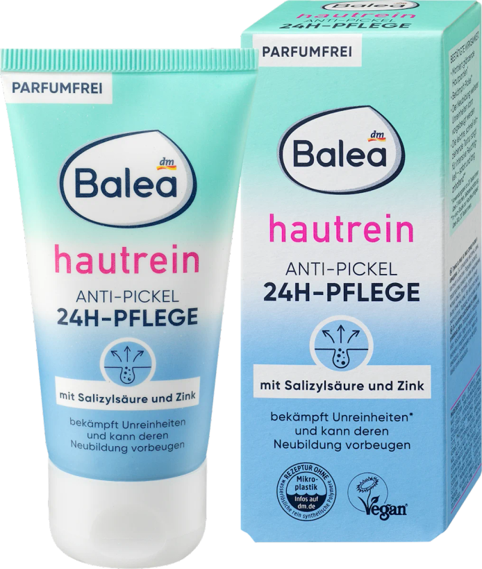 Hautrein Anti-Pimple 24h Care از Balea به عنوان یک مراقبت ویژه برای جوش ها و جوش های سرسیاه ایده آل است. مراقبت از صورت می تواند با جوش ها مقابله کرده و از تشکیل مجدد آنها جلوگیری کند. در حالی که اسید سالیسیلیک و زینک به مبارزه با باکتری های مولد جوش کمک می کنند، پانتنول و آلانتوئین دارای خواص تسکین دهنده پوست هستند. علاوه بر این، مراقبت از ضد جوش می تواند مناطق براق پوست را مات کند. بافت سبک و سریع جذب شده، رطوبت شدیدی را در حین استفاده فراهم می کند.